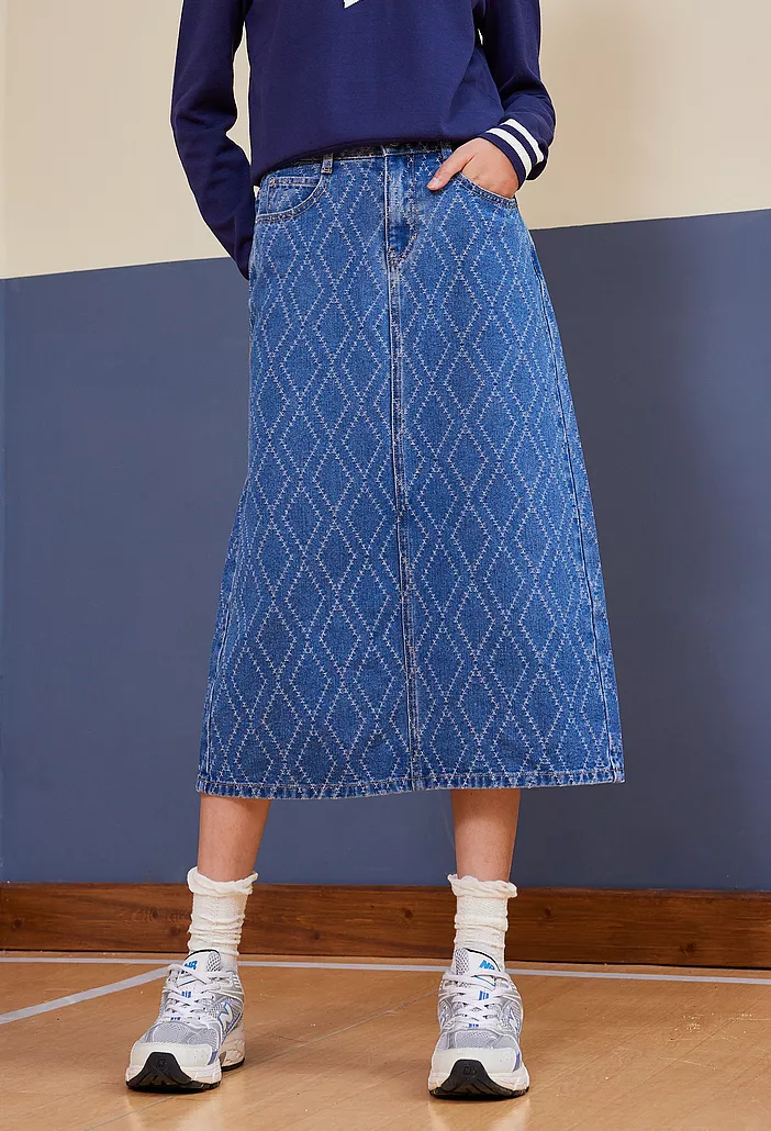 For a cozy winter look, pair this denim skirt with a chunky knit sweater and knee-high boots. For a casual vibe, opt for a fitted turtleneck and ankle boots, accessorized with a scarf or a statement belt. The versatile solid color and clean silhouette allow you to experiment with layering and seasonal accessories to create your signature style.