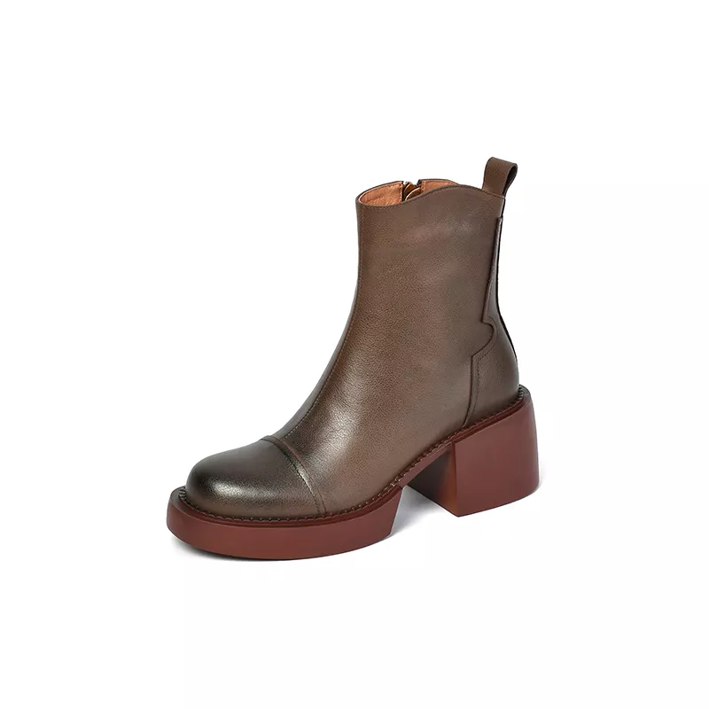 Women’s Retro Leather Ankle Boots with Thick Heels and Side Zipper