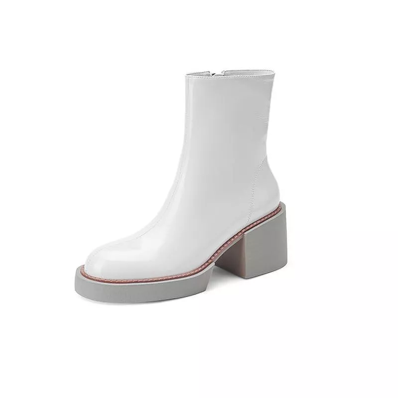Crafted from genuine cow leather, these ankle-high boots provide both elegance and functionality. The sleek white color complements any outfit, from casual jeans to stylish dresses, while the rubber outsole ensures excellent traction and durability. The short plush lining and insole keep your feet cozy and warm, making them the perfect choice for winter weather. Featuring a square heel that offers a sturdy base and a comfortable lift, these boots are designed to keep you on your feet all day without sacrificing style.