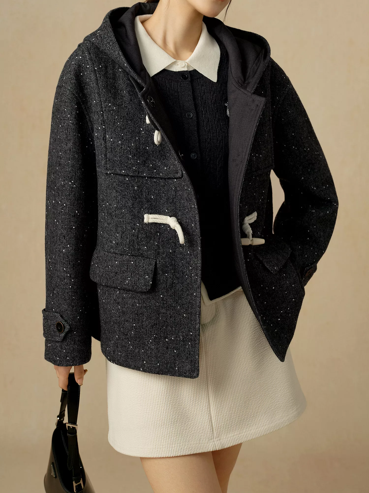 Women’s Winter Hooded Wool-Blend Short Coat with Horn Button Closure