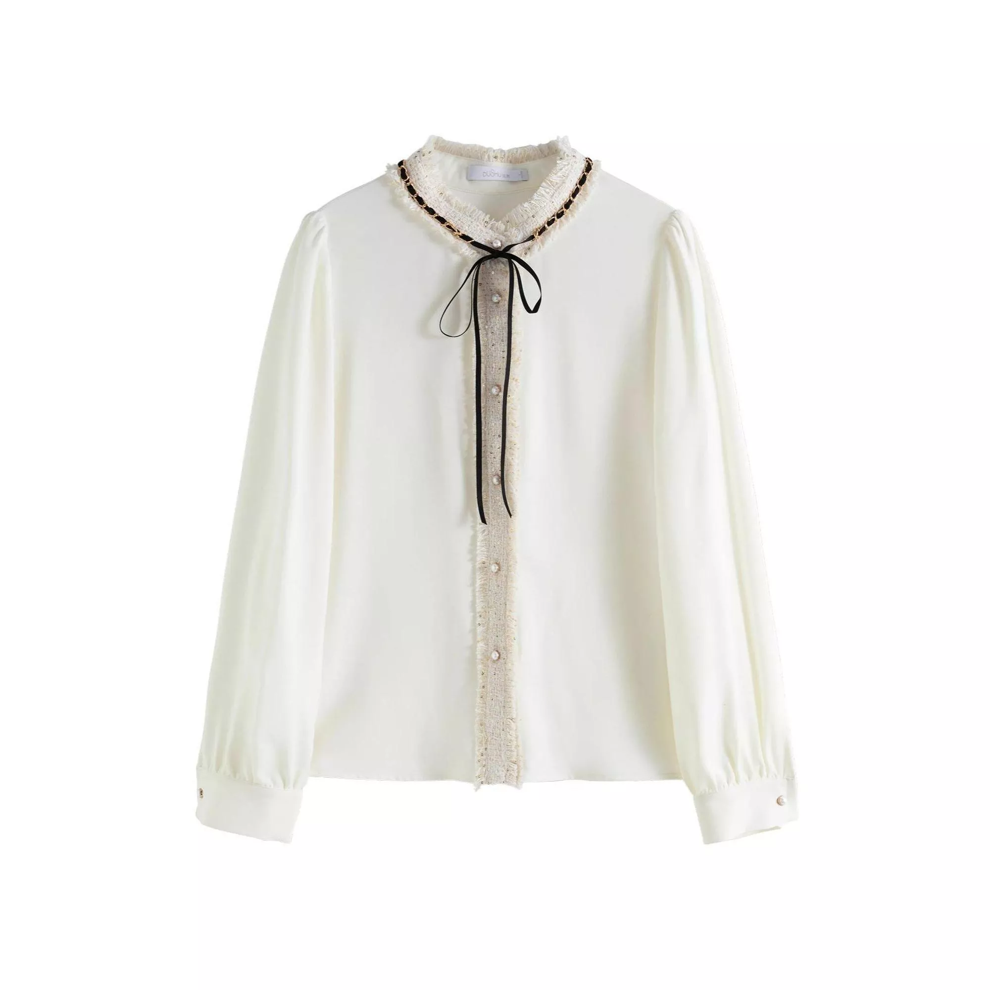 What sets this blouse apart is its sophisticated patchwork design, blending tweed patterns with a polished twill finish. The stand collar and puff sleeves add an air of refinement, making it a versatile piece for your wardrobe. Pair it with trousers or skirts for a complete, chic look.